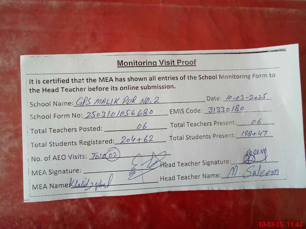 | Attendance Register | Head Teacher | MEA with School | Visit Proof |