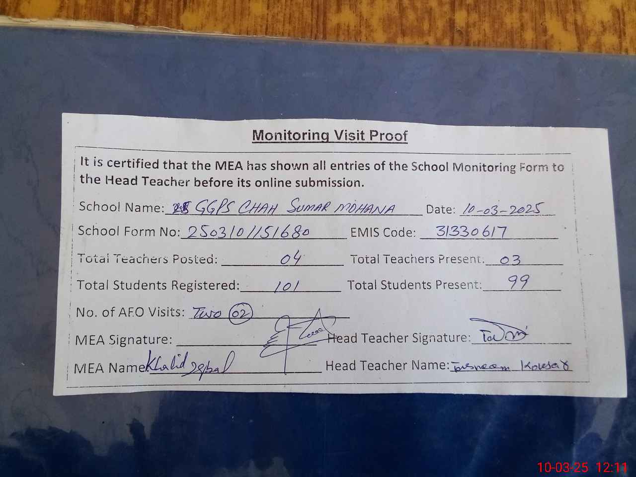 | EMIS Code: 31330617 | Name of School: GGPS CHAH SUMAR MOHANA | |||