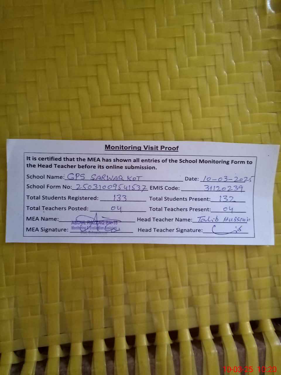 | Attendance Register | Head Teacher | MEA with School | Visit Proof |
