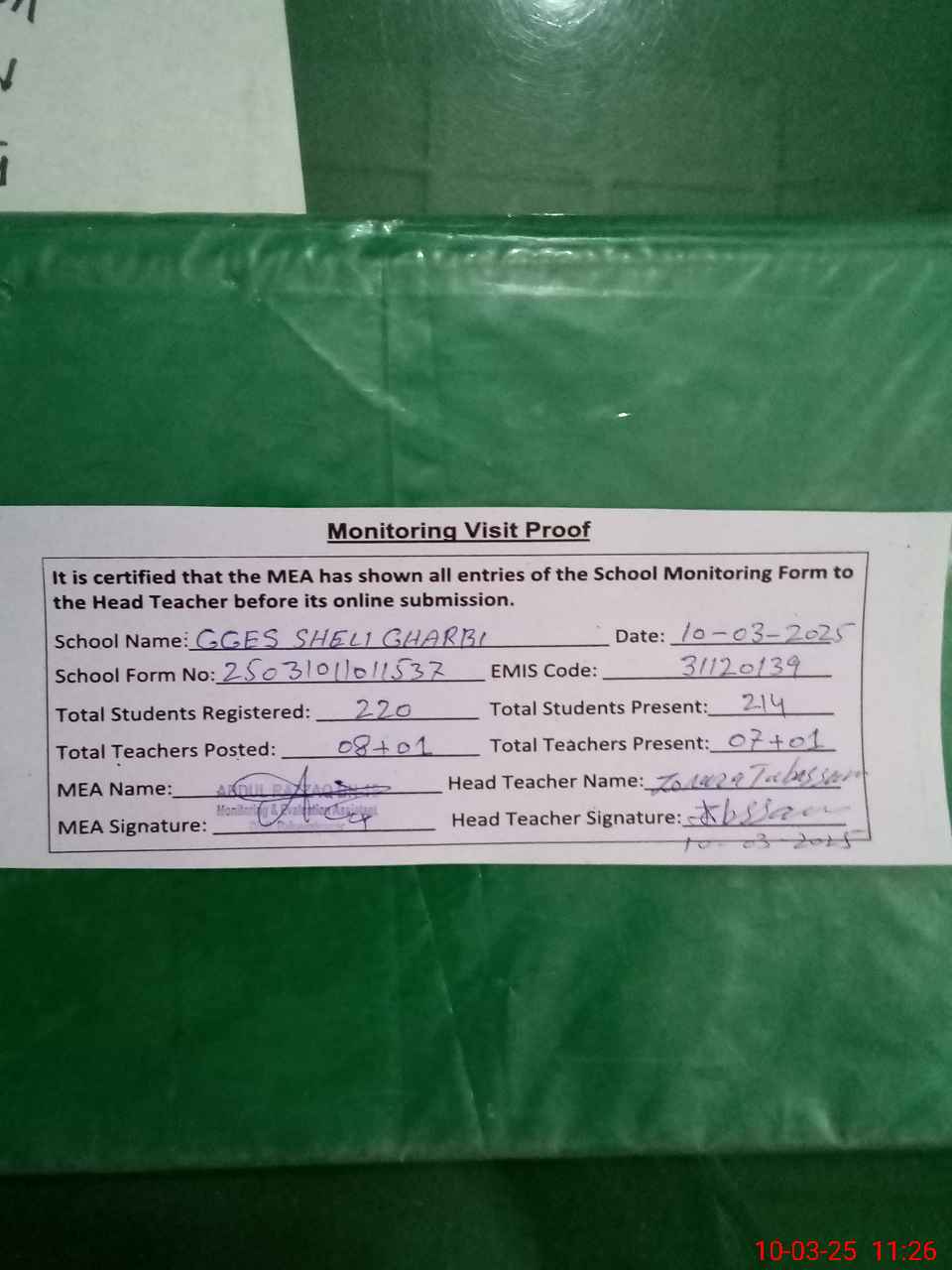 | Attendance Register | Head Teacher | MEA with School | Visit Proof |