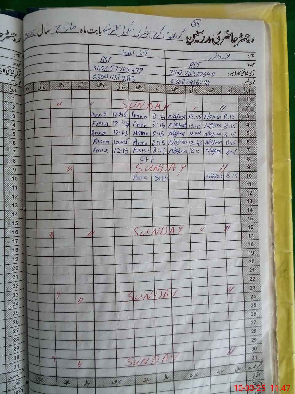 | Name: NA**** KH**** Designation: (School Headmaster's/Headmistress's) PST ARTS Phone/Cell Number: 03**** |