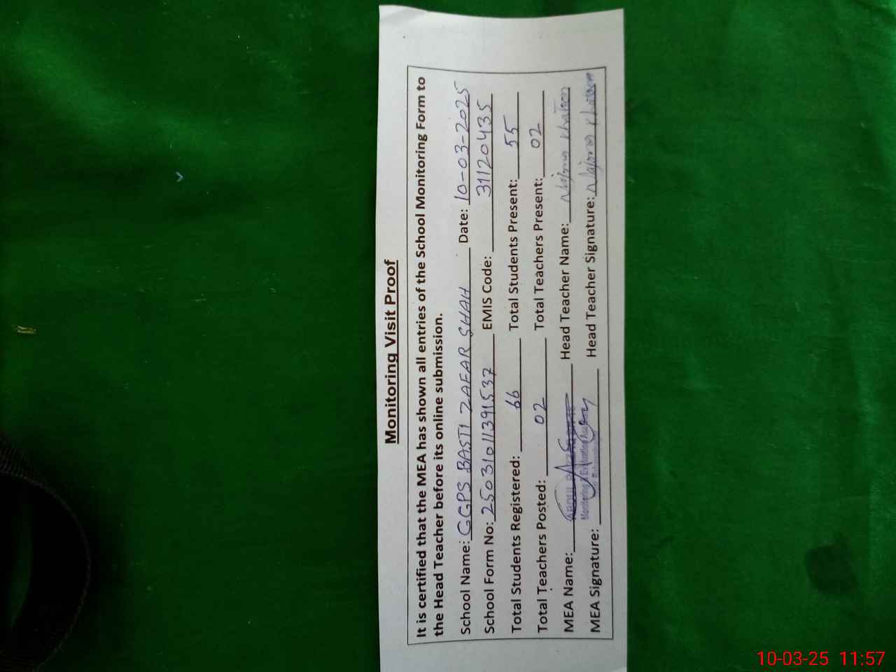 | Attendance Register | Head Teacher | MEA with School | Visit Proof |