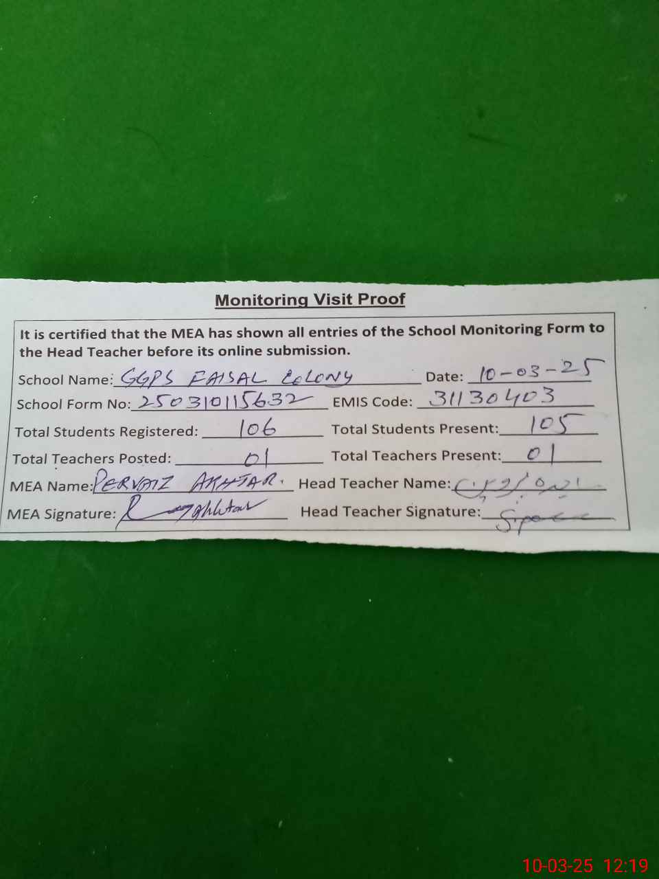 | Attendance Register | Head Teacher | MEA with School | Visit Proof |