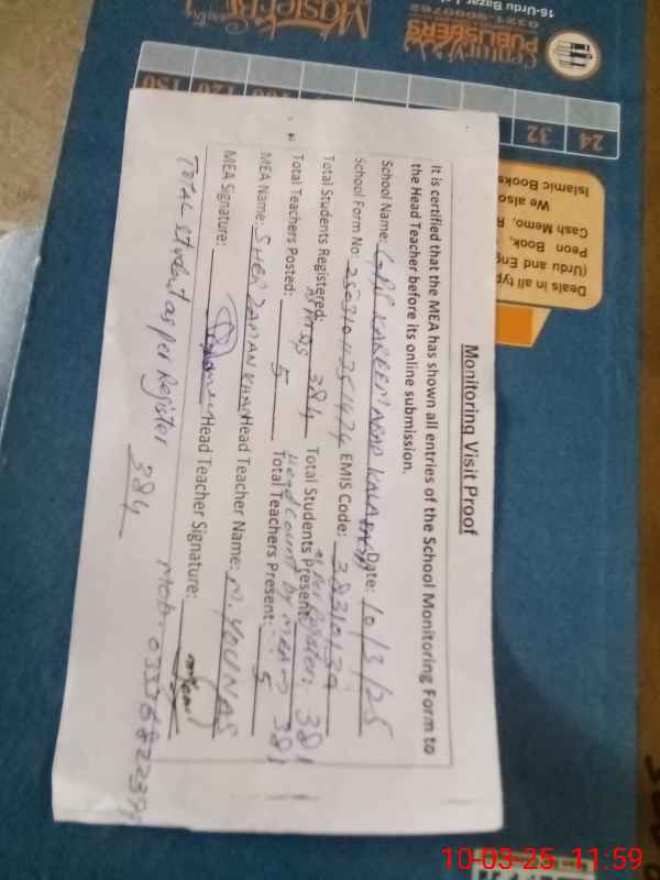 | Name: Za**** Iq**** Designation: (School Headmaster's/Headmistress's) PST/ Phone/Cell Number: 03**** |