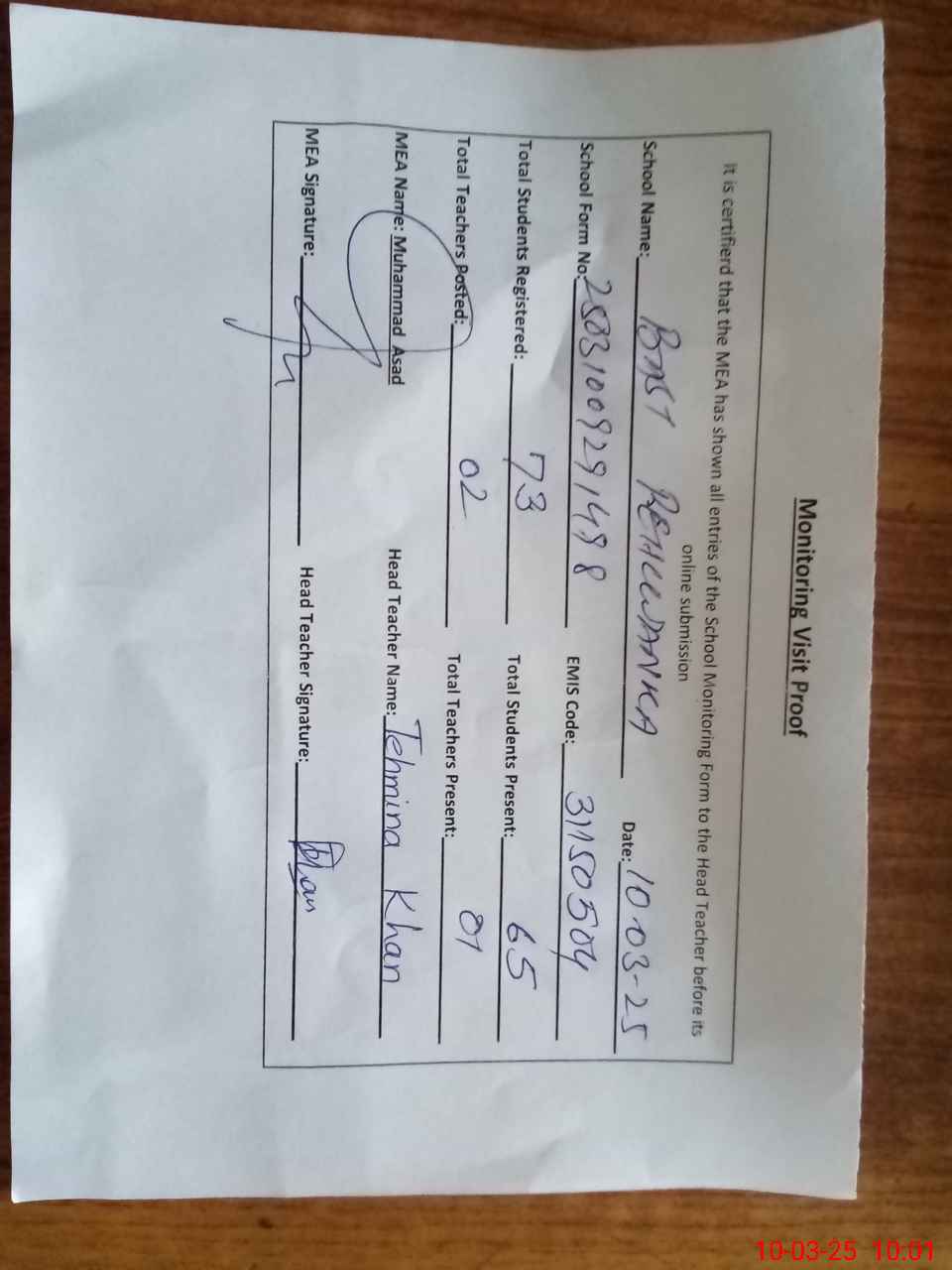 | Remarks (Use Separate Page if Required): Teachers Asia Parveen was on medical leave but No Online Medical leave was shown to MEA Drinking water not placed in classrooms | |||||