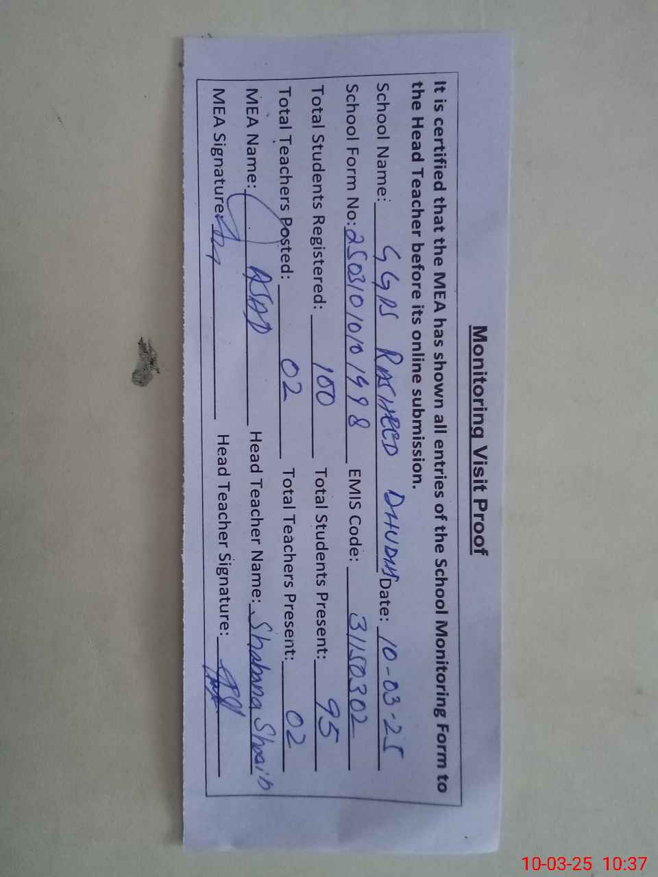 | Attendance Register | Head Teacher | MEA with School | Visit Proof |