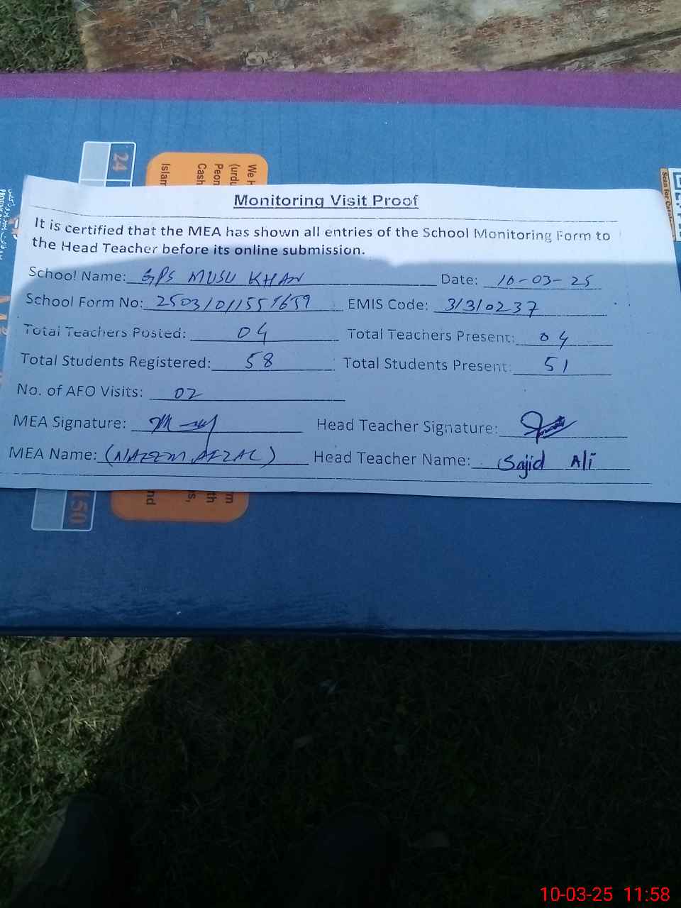 | EMIS Code: 31310237 | Name of School: GPS MUSU KHAN | |||