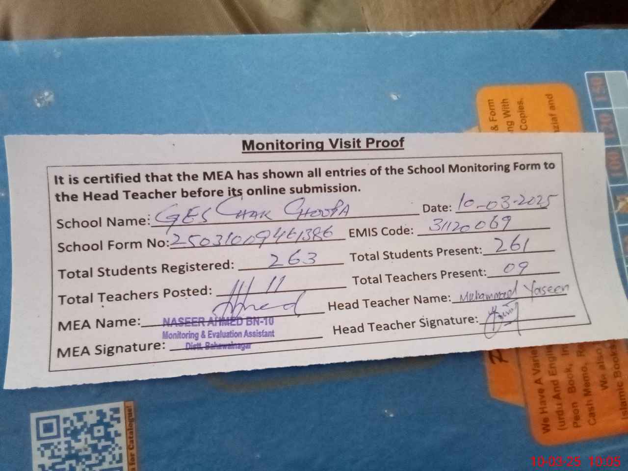 | Attendance Register | Head Teacher | MEA with School | Visit Proof |