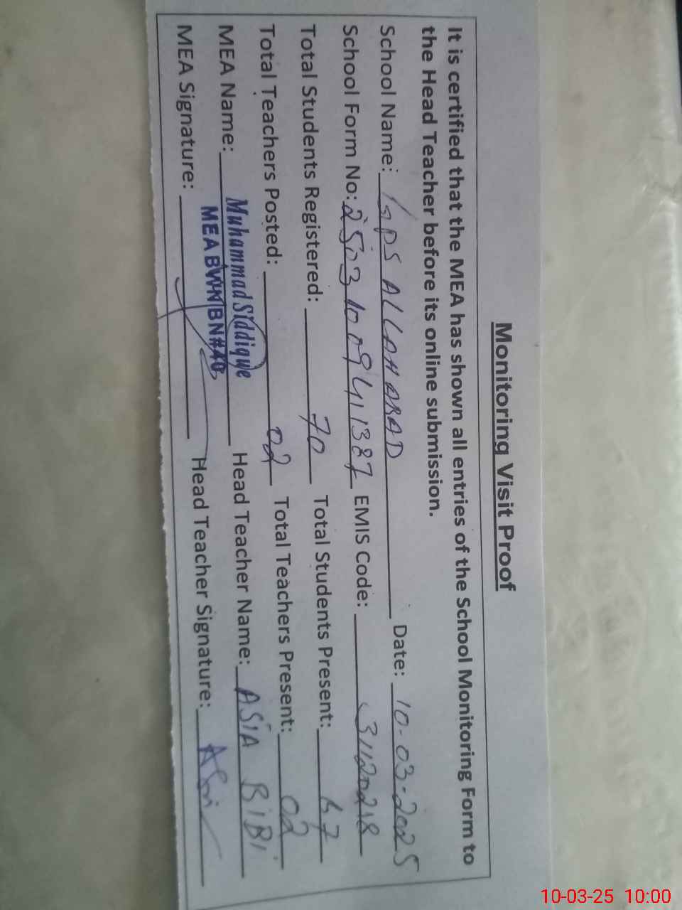 | Certified that this School was Inspected by the Undersigned MEA/DMO Today and the Information Stated Above is as Per Record. | |||||