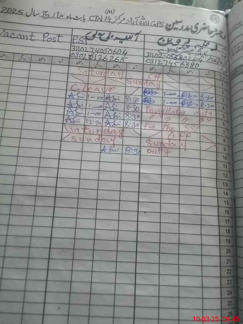 | 31**** | Ra**** Pe**** | PST | Regular | 0 | 0 | 0 | 0 | 0 | 0 | 0 | 0 | 0 | Exam Duty |
