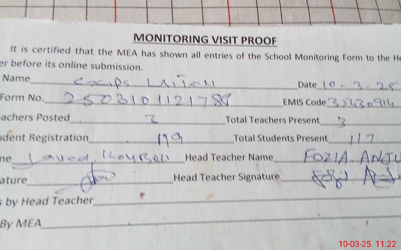 | Attendance Register | Head Teacher | MEA with School | Visit Proof |