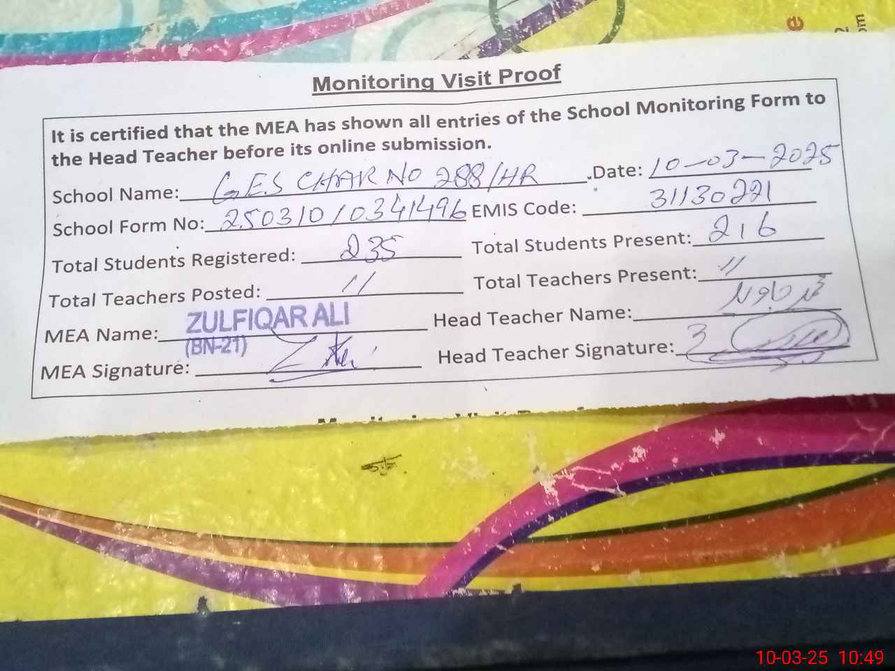 | EMIS Code: 31130221 | Name of School: GES CHAK NO 288 HR | |||