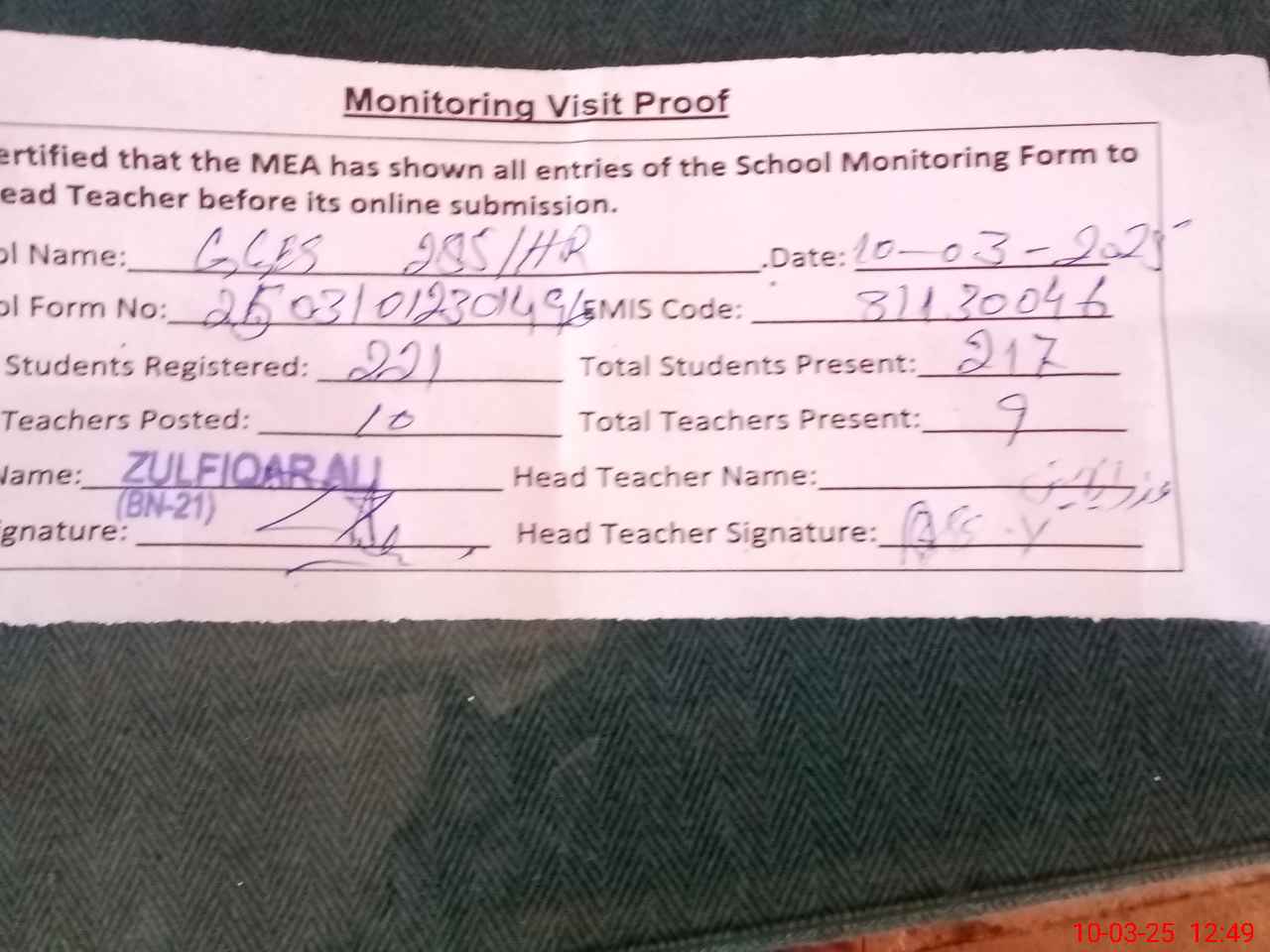 | Monitoring Date: 10-03-2025 | Start Time: 10-03-2025 12:30 PM | End Time: 10-03-2025 12:49 PM | Name of MEA: Zu**** Al**** BN**** | |