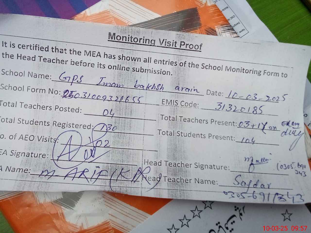| EMIS Code: 31320185 | Name of School: GPS IMAM BAKHASH ARAIN | |||