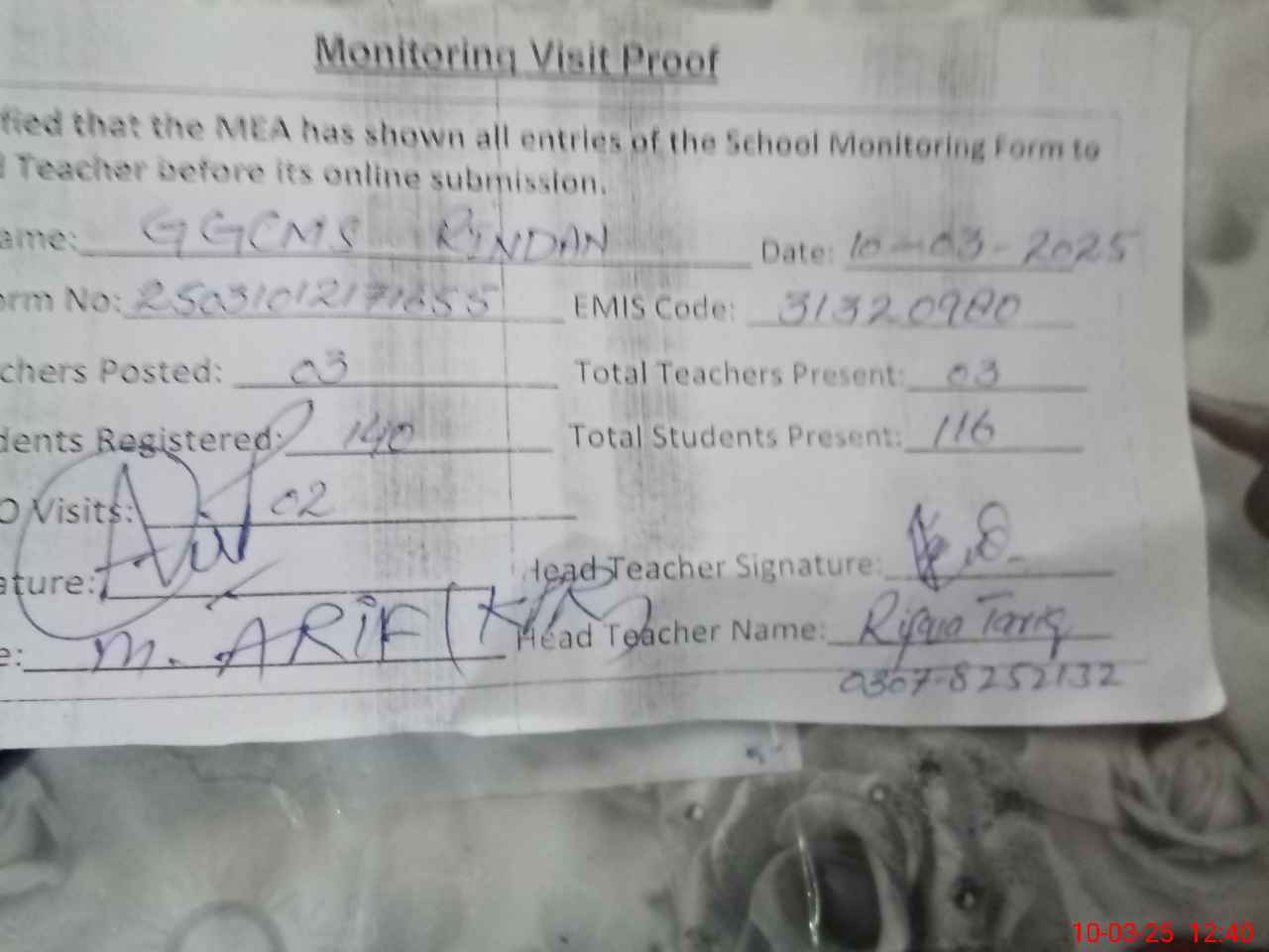| Attendance Register | Head Teacher | MEA with School | Visit Proof |