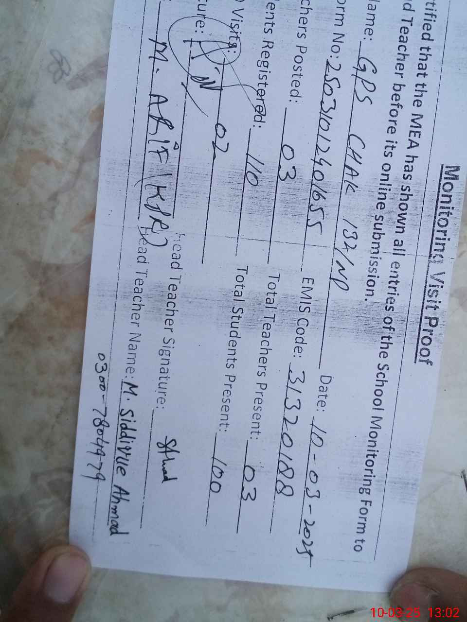 | EMIS Code: 31320188 | Name of School: GPS CHAK 132/NP | |||