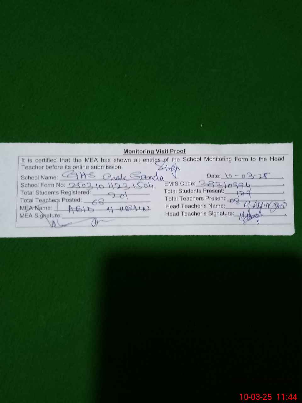 | Certified that this School was Inspected by the Undersigned MEA/DMO Today and the Information Stated Above is as Per Record. | |||||