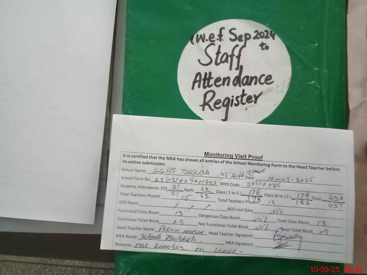 | Attendance Register | Head Teacher | MEA with School | Visit Proof |