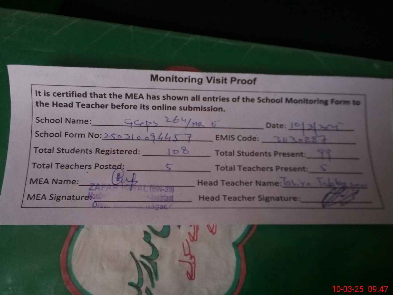 | EMIS Code: 31130287 | Name of School: GGPS CHAK NO. 264 HR W | |||