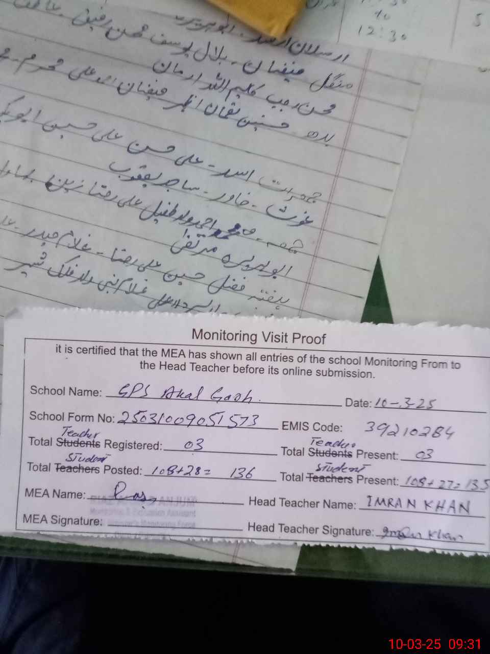 | Name: Im**** Kh**** Designation: (School Headmaster's/Headmistress's) PST Phone/Cell Number: 03**** |
