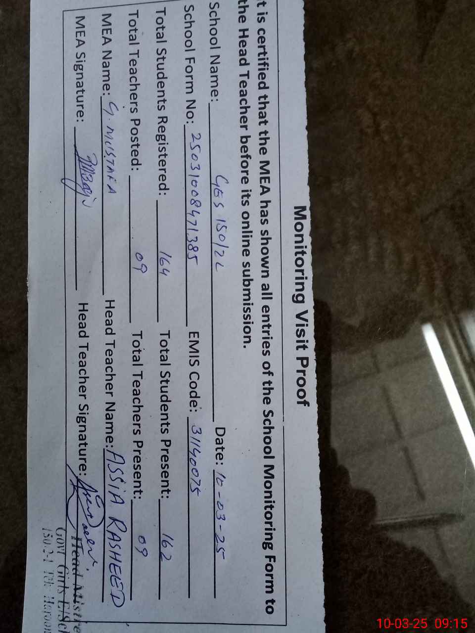| Certified that this School was Inspected by the Undersigned MEA/DMO Today and the Information Stated Above is as Per Record. | |||||