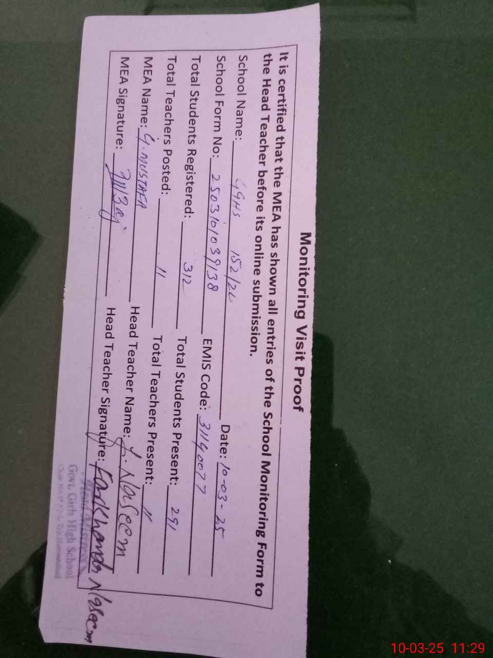 | Certified that this School was Inspected by the Undersigned MEA/DMO Today and the Information Stated Above is as Per Record. | |||||
