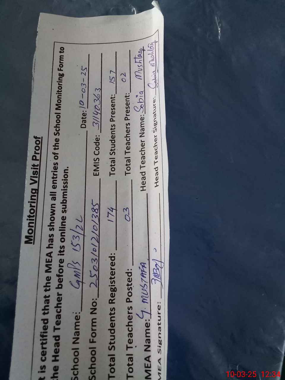 | Attendance Register | Head Teacher | MEA with School | Visit Proof |