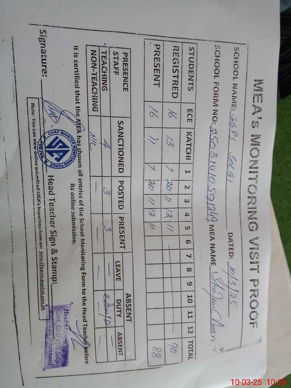 | Attendance Register | Head Teacher | MEA with School | Visit Proof |