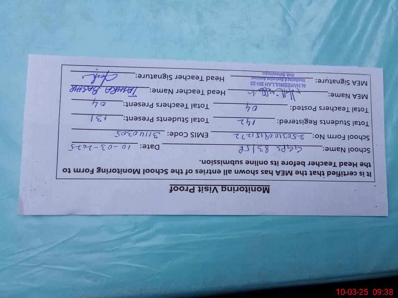| Monitoring Date: 10-03-2025 | Start Time: 10-03-2025 09:15 AM | End Time: 10-03-2025 09:39 AM | Name of MEA: Mu**** ha**** ul**** BN25 | |