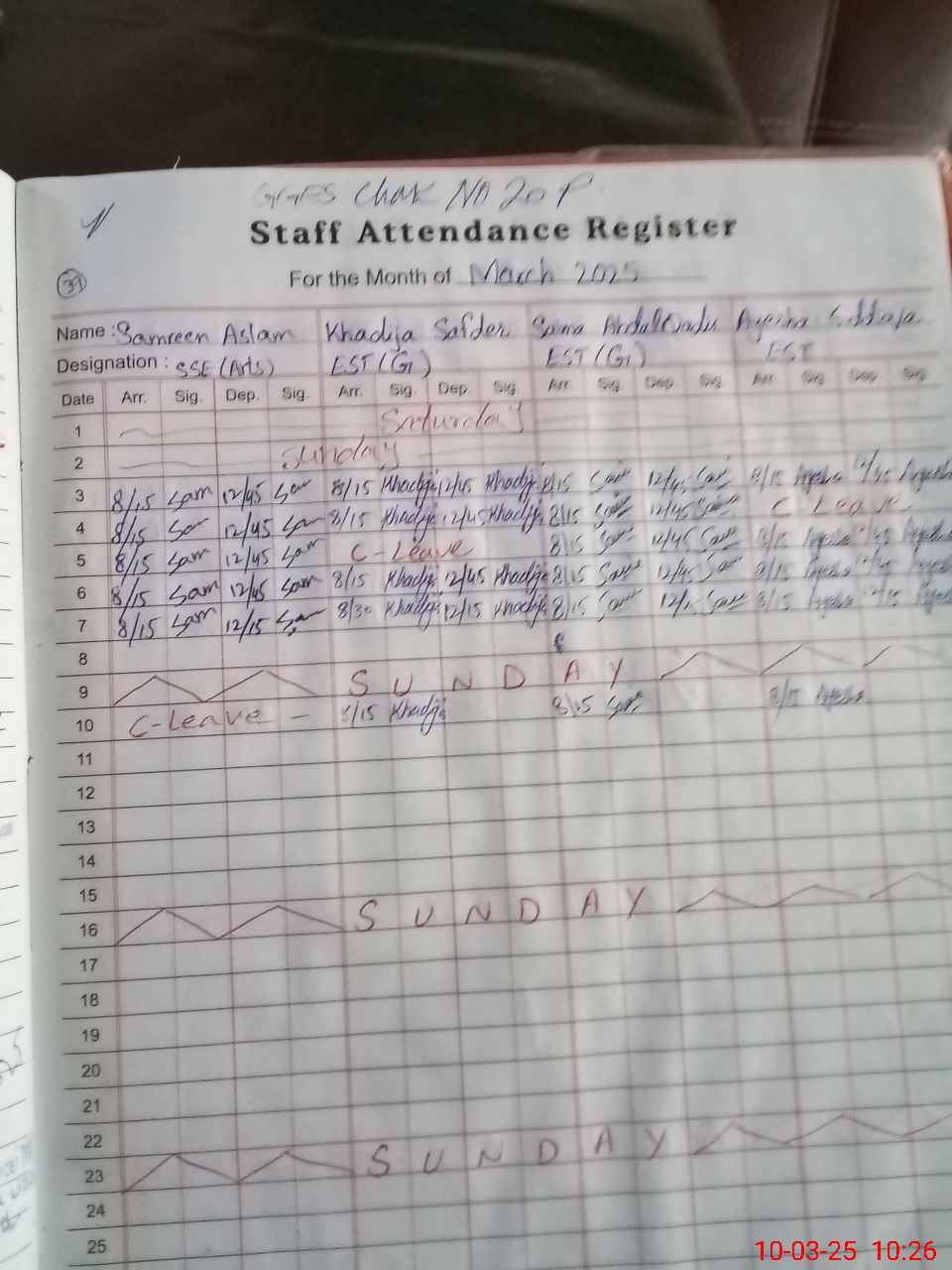 | 31**** | Sa**** An**** | CHOWKIDAR | Regular | 11 | 0 | 0 | 0 | 0 | 9 | 0 | 0 | 2 | Other |