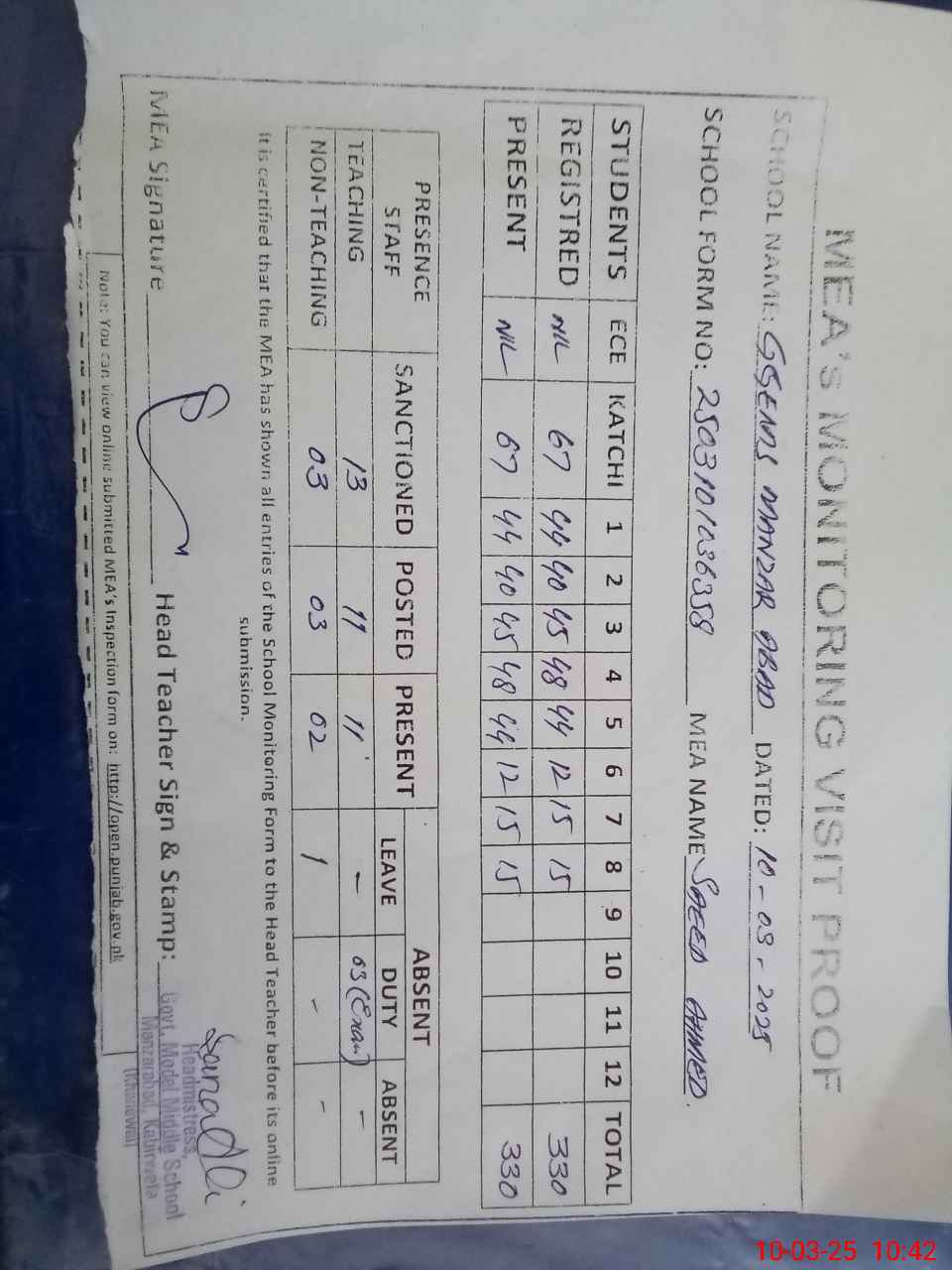 | Certified that this School was Inspected by the Undersigned MEA/DMO Today and the Information Stated Above is as Per Record. | |||||