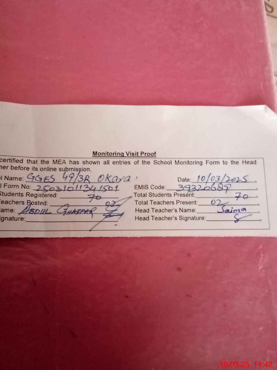 | Certified that this School was Inspected by the Undersigned MEA/DMO Today and the Information Stated Above is as Per Record. | |||||