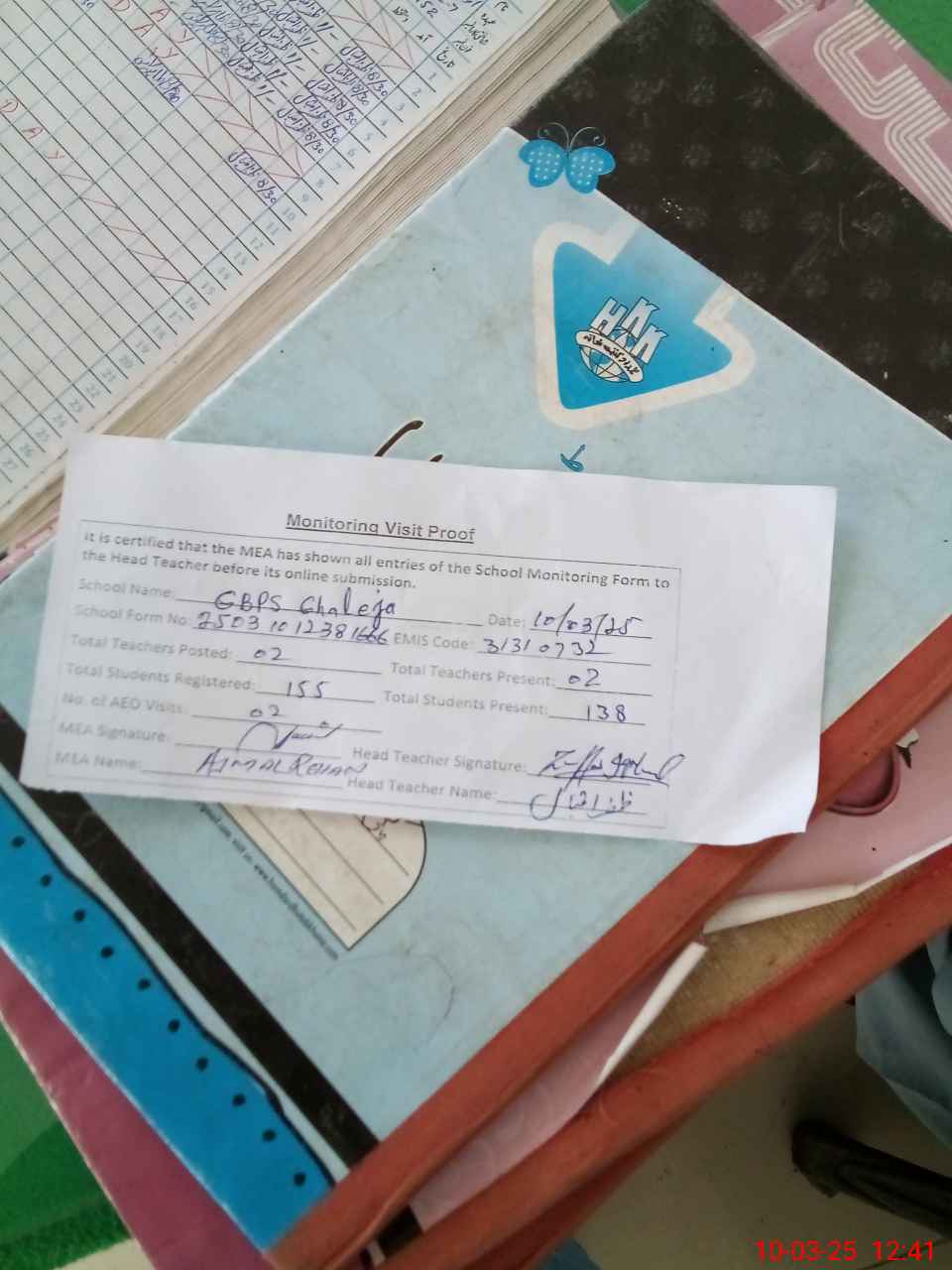 | Attendance Register | Head Teacher | MEA with School | Visit Proof |