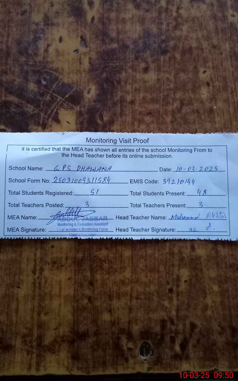| EMIS Code: 39210144 | Name of School: GPS DHAWANA | |||