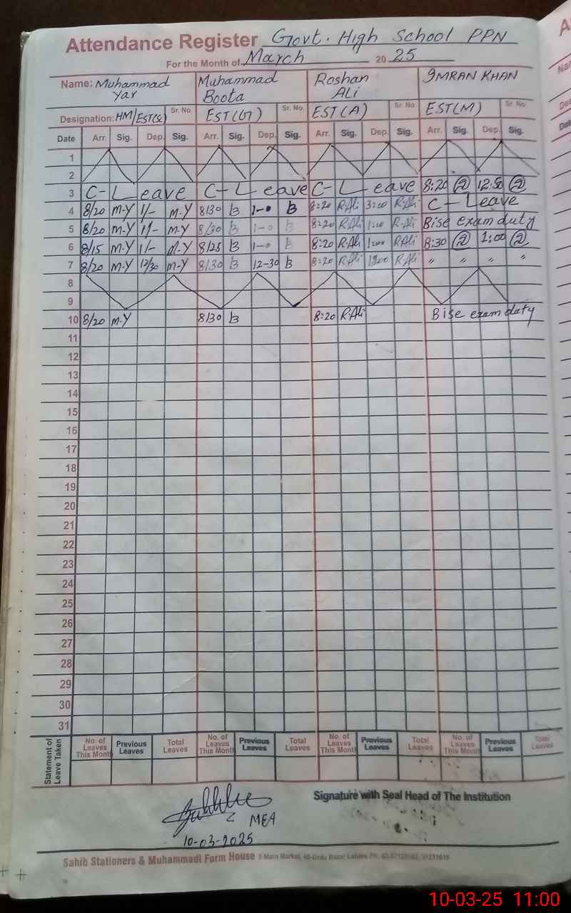 | 36**** | Im**** Kh**** | 1 | 2 | 0 | 0 | 0 | 0 | 0 | 0 | 0 | 2 | Absent (Un-Authorized) | |