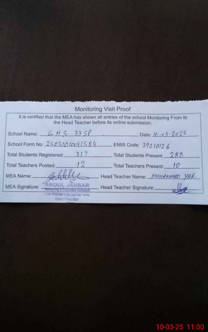 | EMIS Code: 39210126 | Name of School: GHS 33 SP | |||