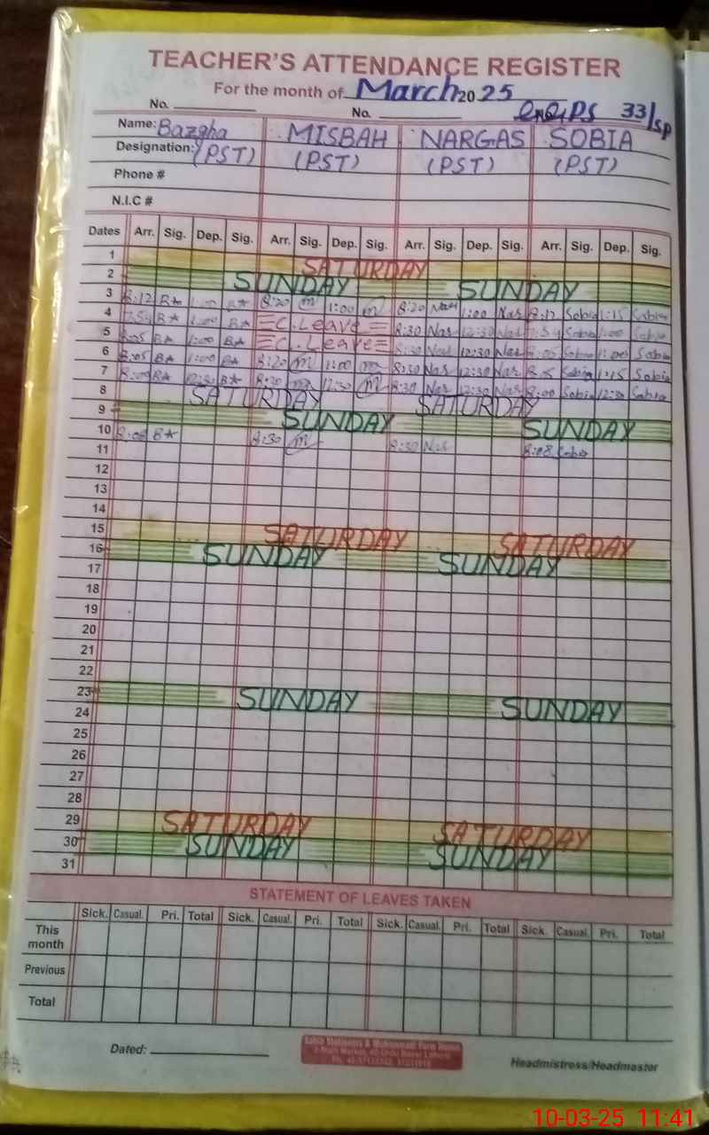 | 36**** | Sh**** Ak**** | PST | Regular | 3 | 0 | 0 | 0 | 0 | 0 | 0 | 0 | 3 | Exam Duty |