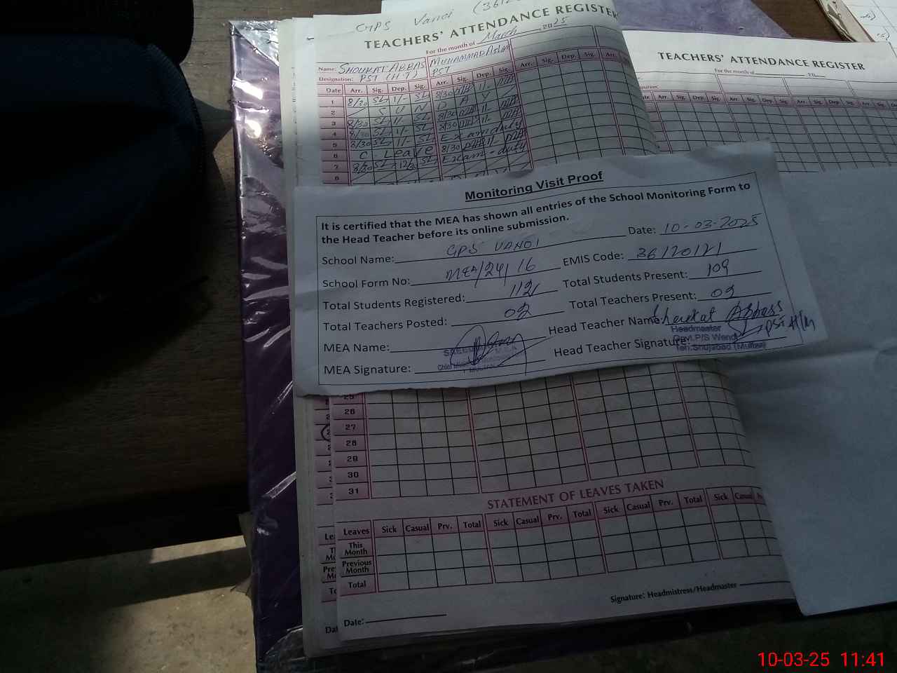 | Attendance Register | Head Teacher | MEA with School | Visit Proof |