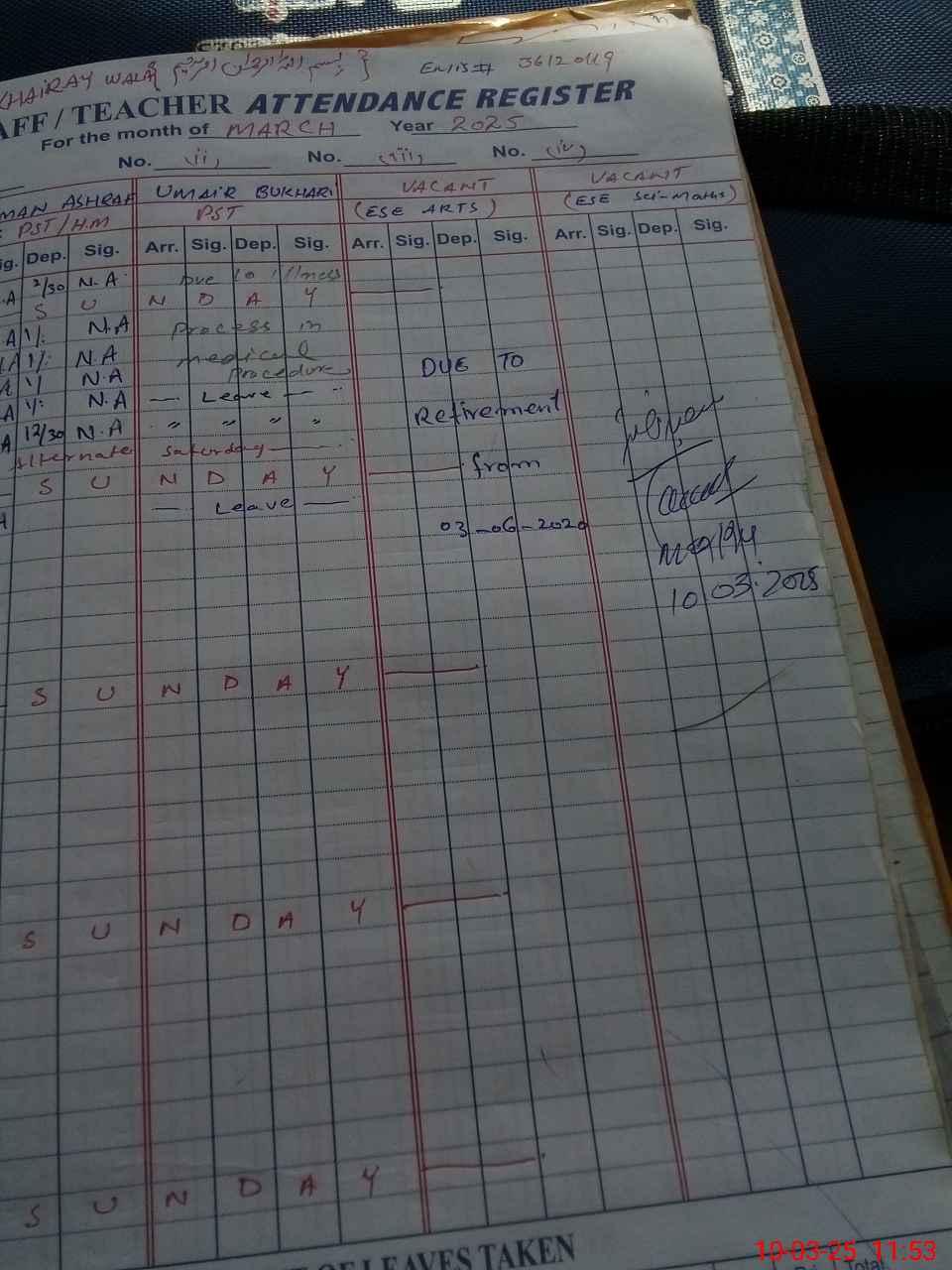 | Name: NA**** AS**** Designation: (School Headmaster's/Headmistress's) ESE (Arts ) Phone/Cell Number: 03**** |