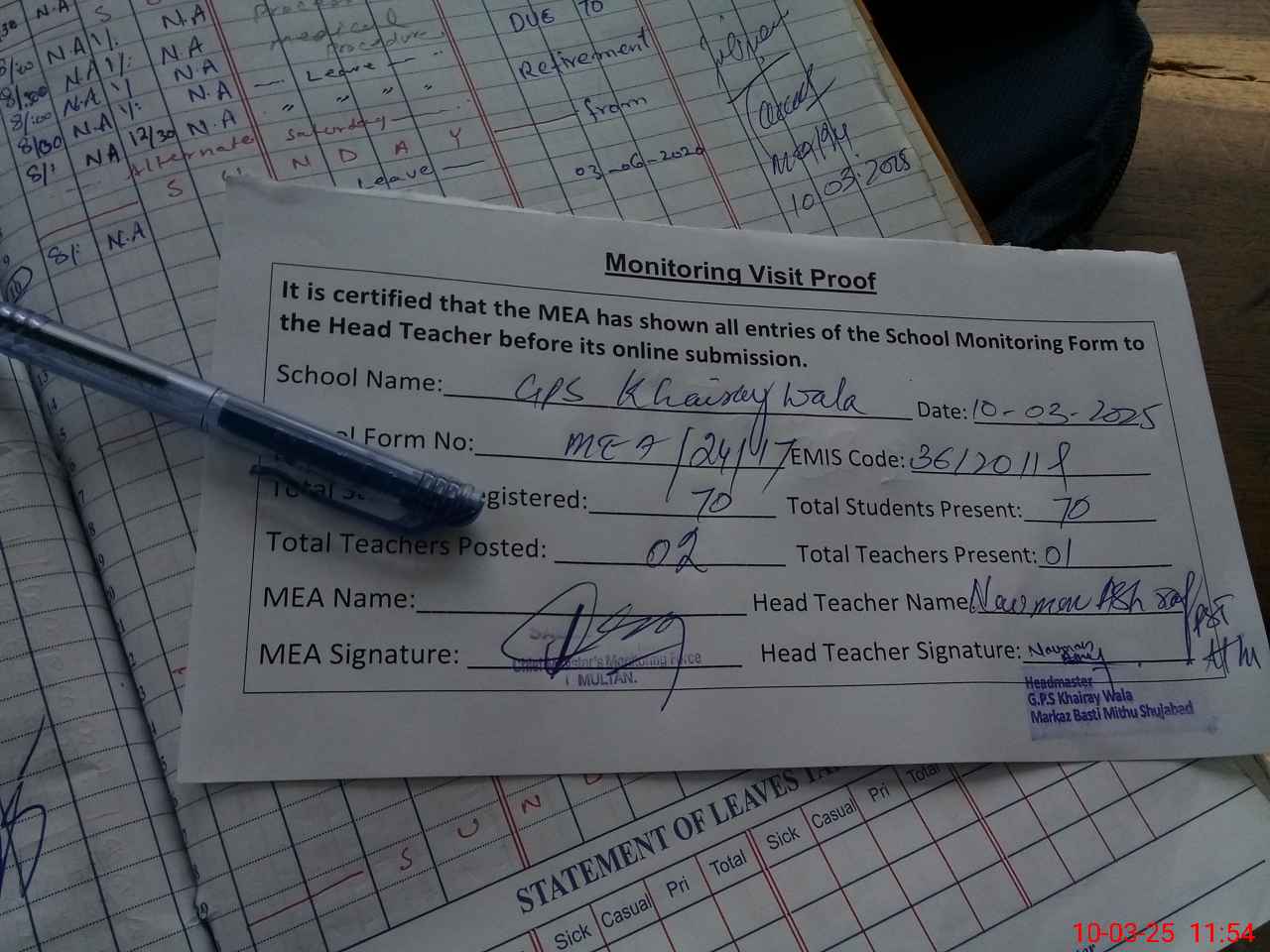 | Attendance Register | Head Teacher | MEA with School | Visit Proof |