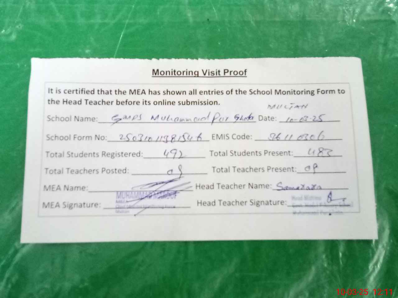 | Attendance Register | Head Teacher | MEA with School | Visit Proof |