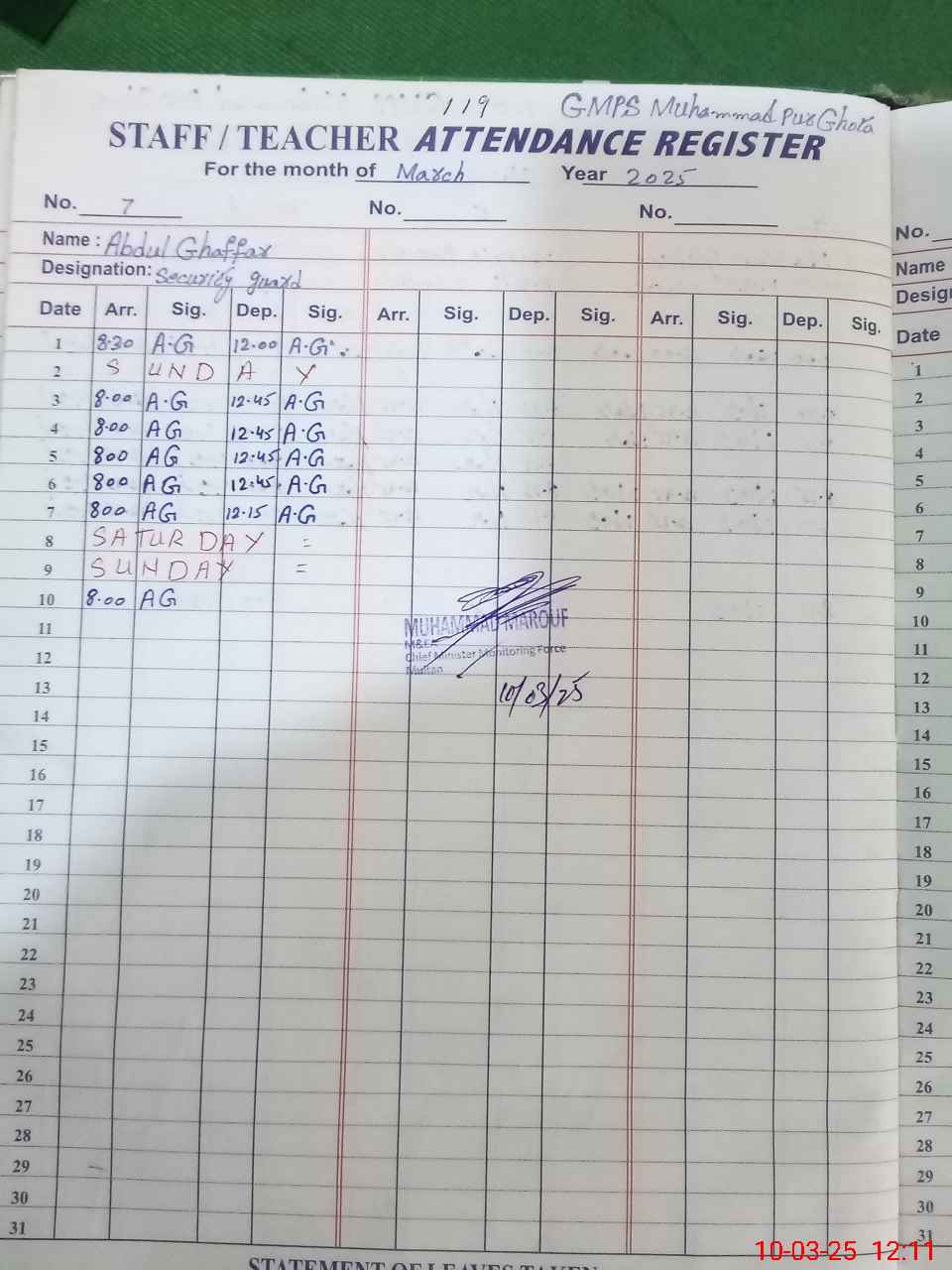 | Monitoring Date: 10-03-2025 | Start Time: 10-03-2025 11:38 AM | End Time: 10-03-2025 12:12 PM | Name of MEA: Mu**** Ma**** | |