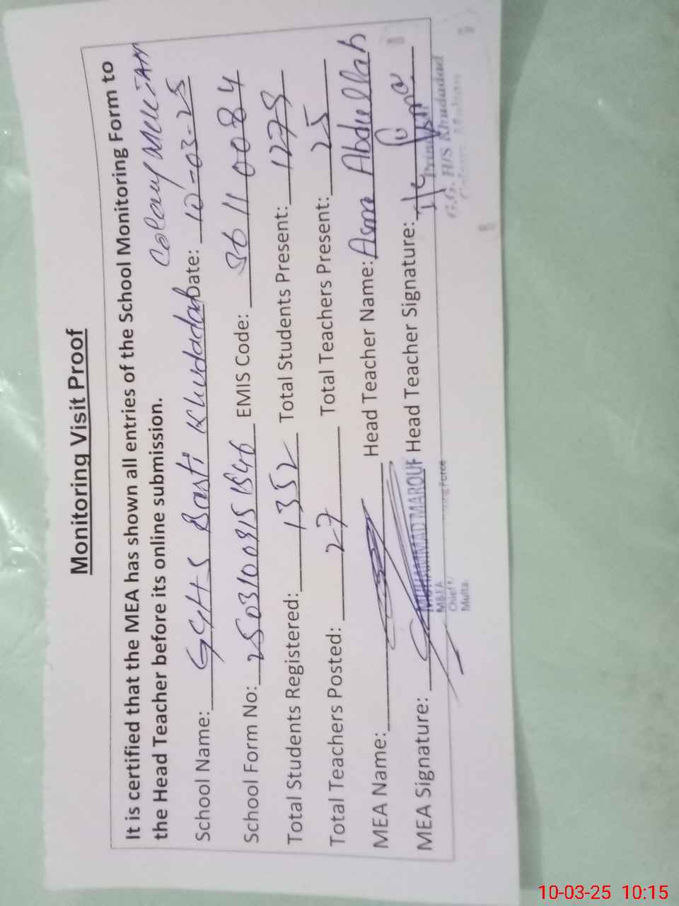 | EMIS Code: 36110084 | Name of School: GGHS BASTI KHUDA DAD MULTAN | |||