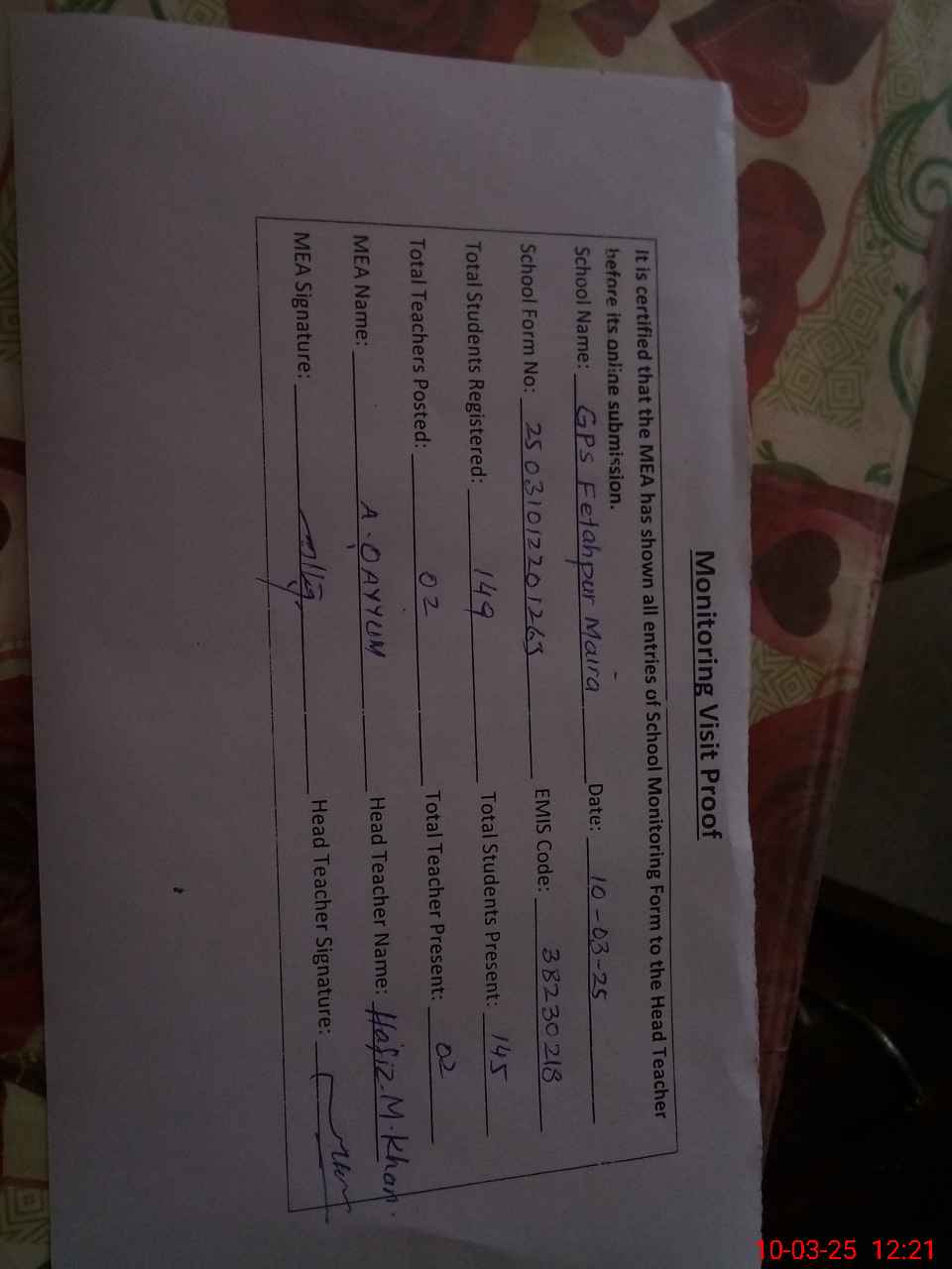| Attendance Register | Head Teacher | MEA with School | Visit Proof |