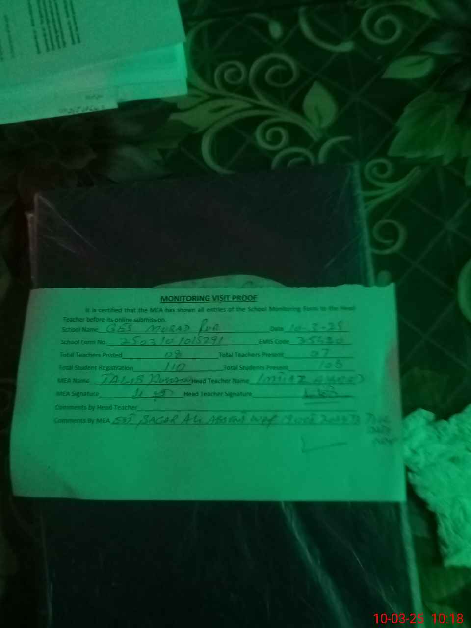 | Attendance Register | Head Teacher | MEA with School | Visit Proof |