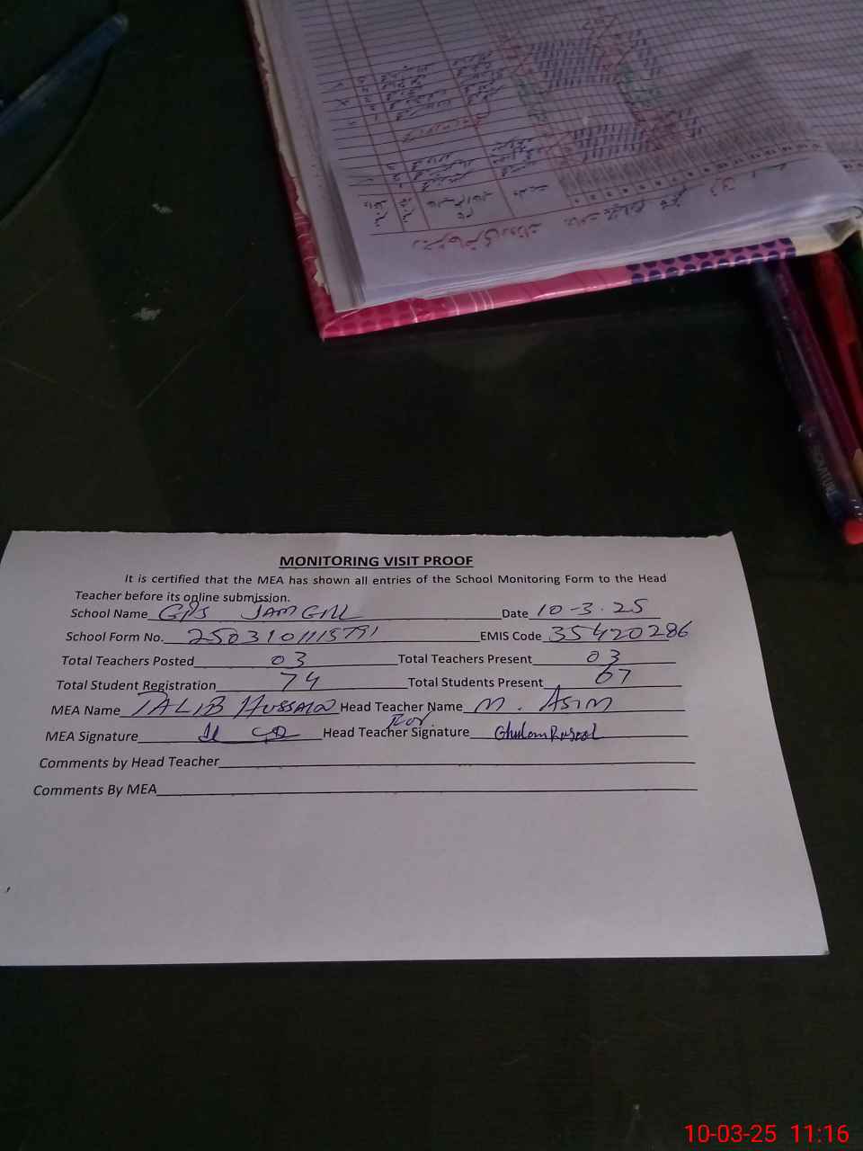 | Attendance Register | Head Teacher | MEA with School | Visit Proof |