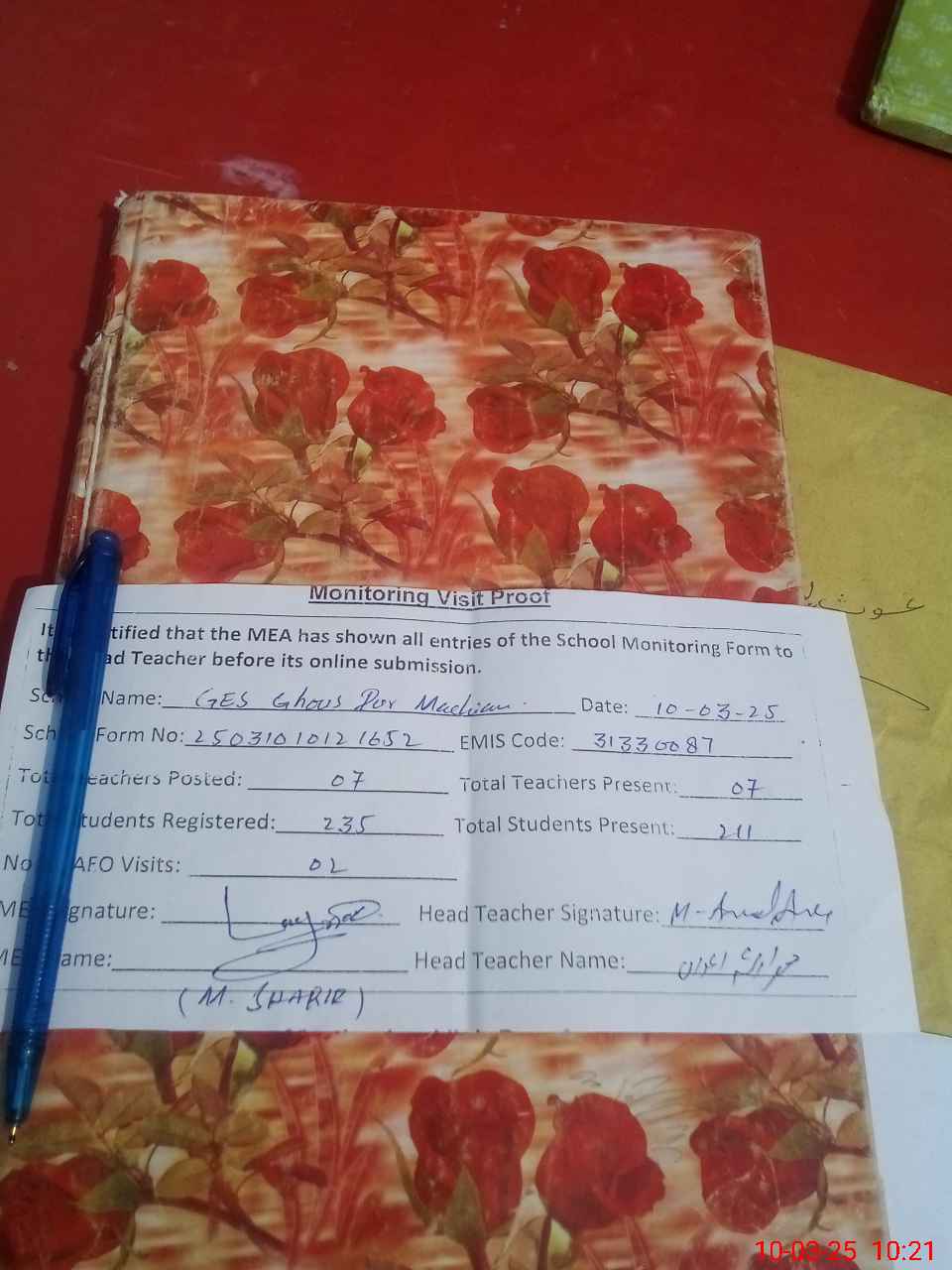 | Attendance Register | Head Teacher | MEA with School | Visit Proof |