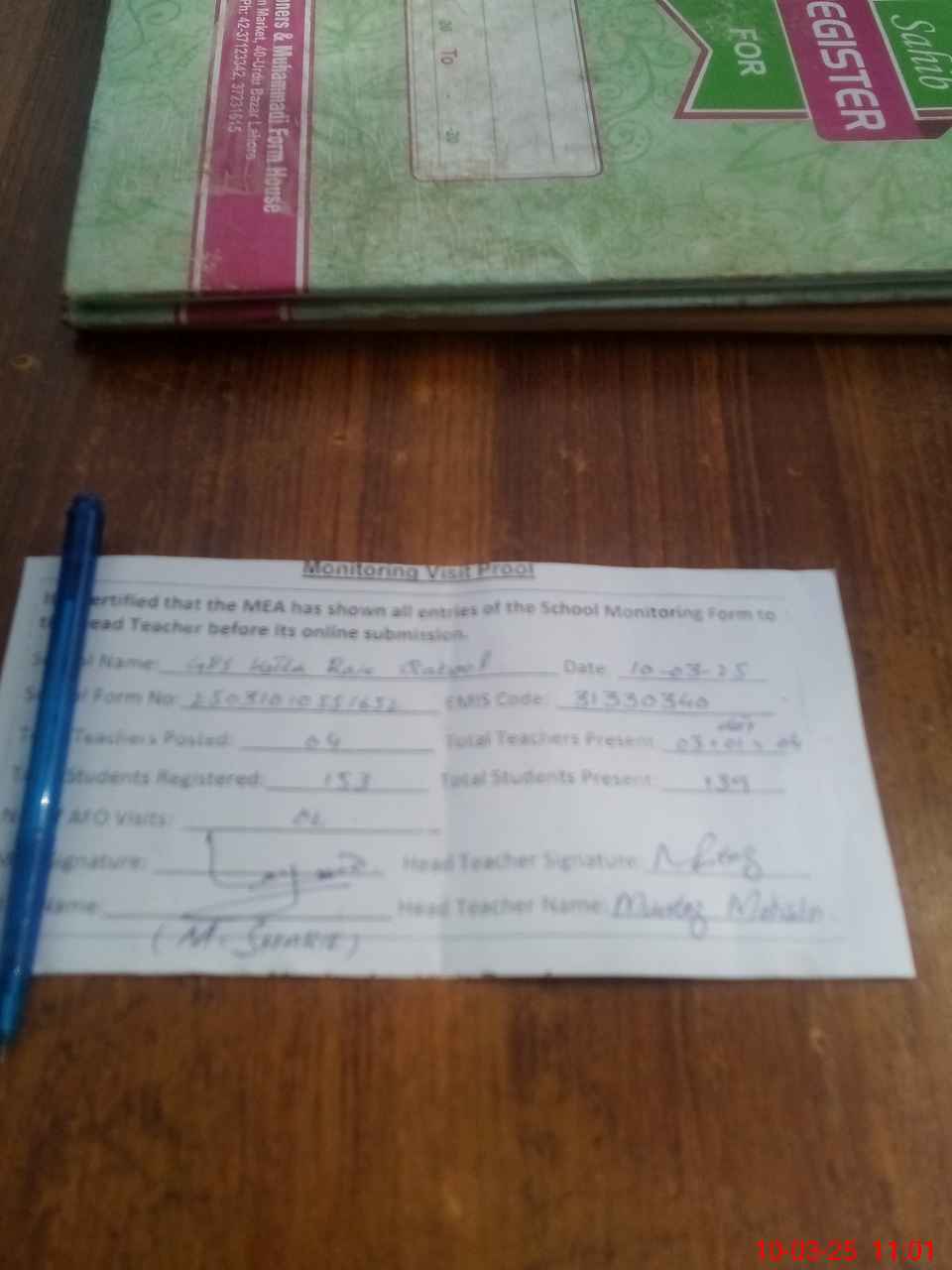 | Attendance Register | Head Teacher | MEA with School | Visit Proof |