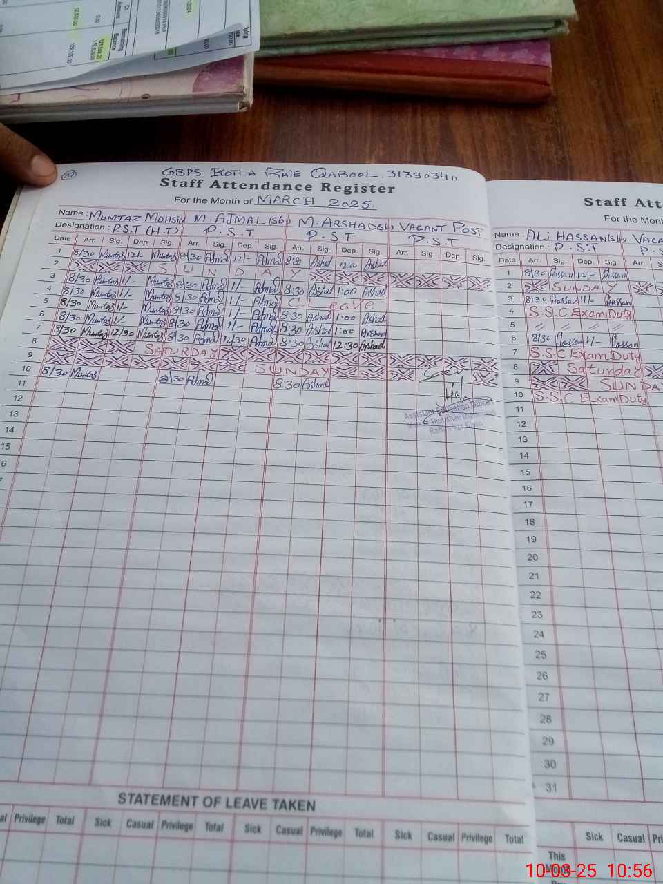 | 31**** | Al**** Ha**** Kh**** | PST | Regular | 0 | 0 | 0 | 0 | 0 | 0 | 0 | 0 | 0 | Exam Duty |