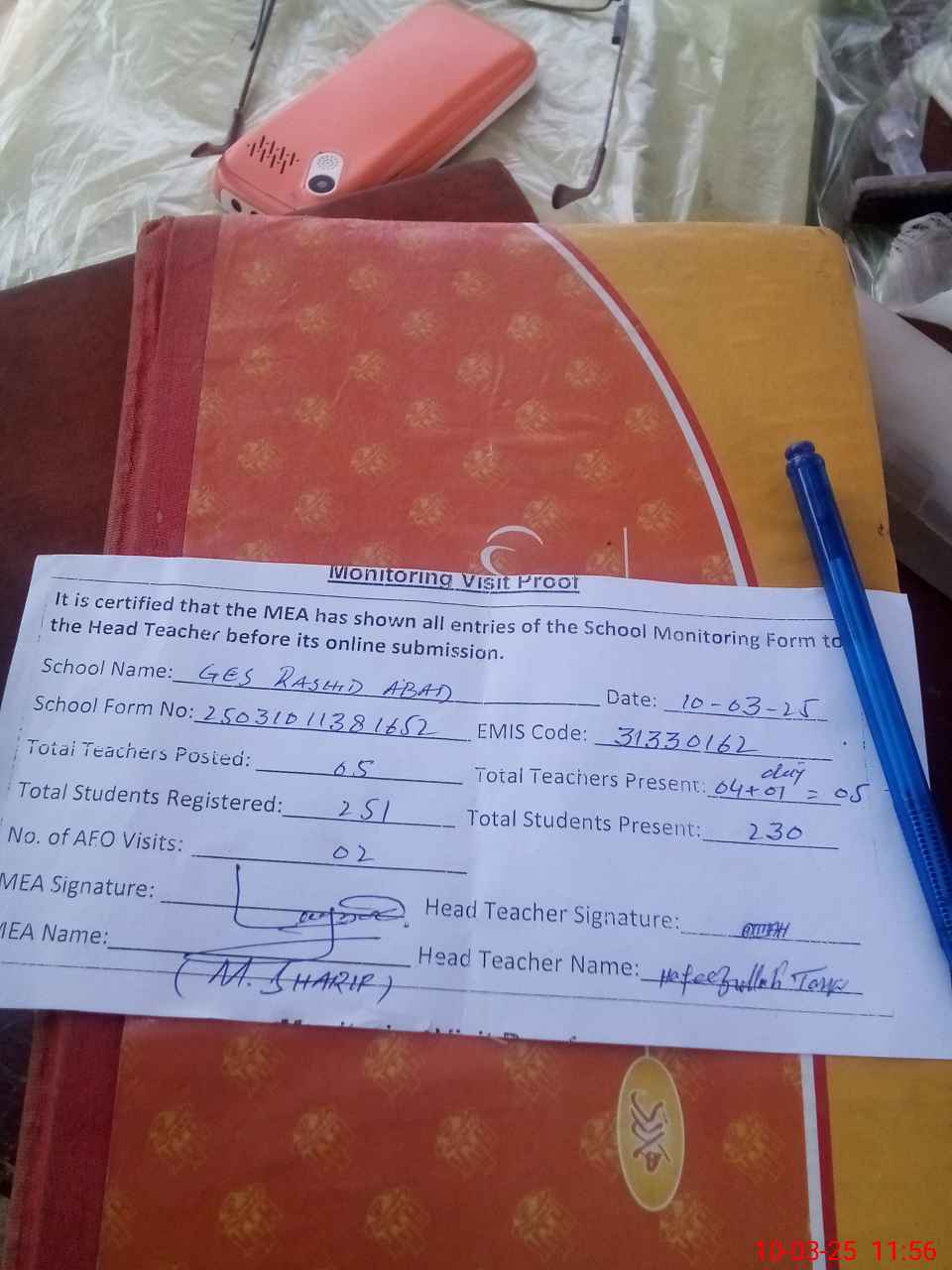 | Attendance Register | Head Teacher | MEA with School | Visit Proof |